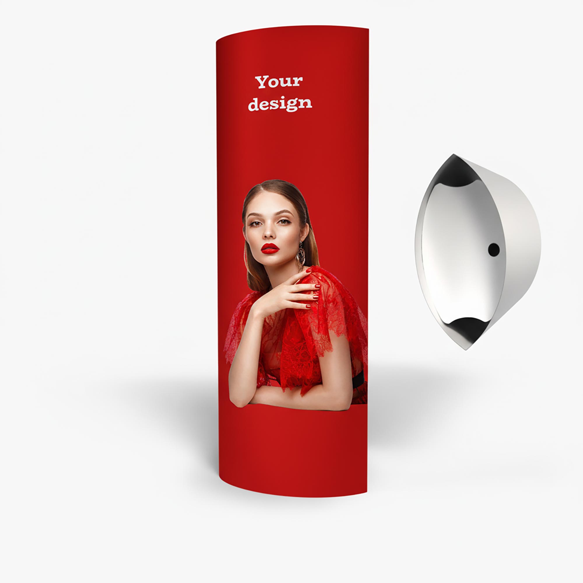 Elipsasti totem može biti potpuno prilagođen vizuelnom identitetu brenda, kampanji ili konkretnom proizvodu. Moguće je odštampati logo, promotivnu poruku, grafiku proizvoda, akcijsku ponudu, informativni sadržaj ili drugi vizual koji treba jasno komunicirati kupcu ili posjetiocu.