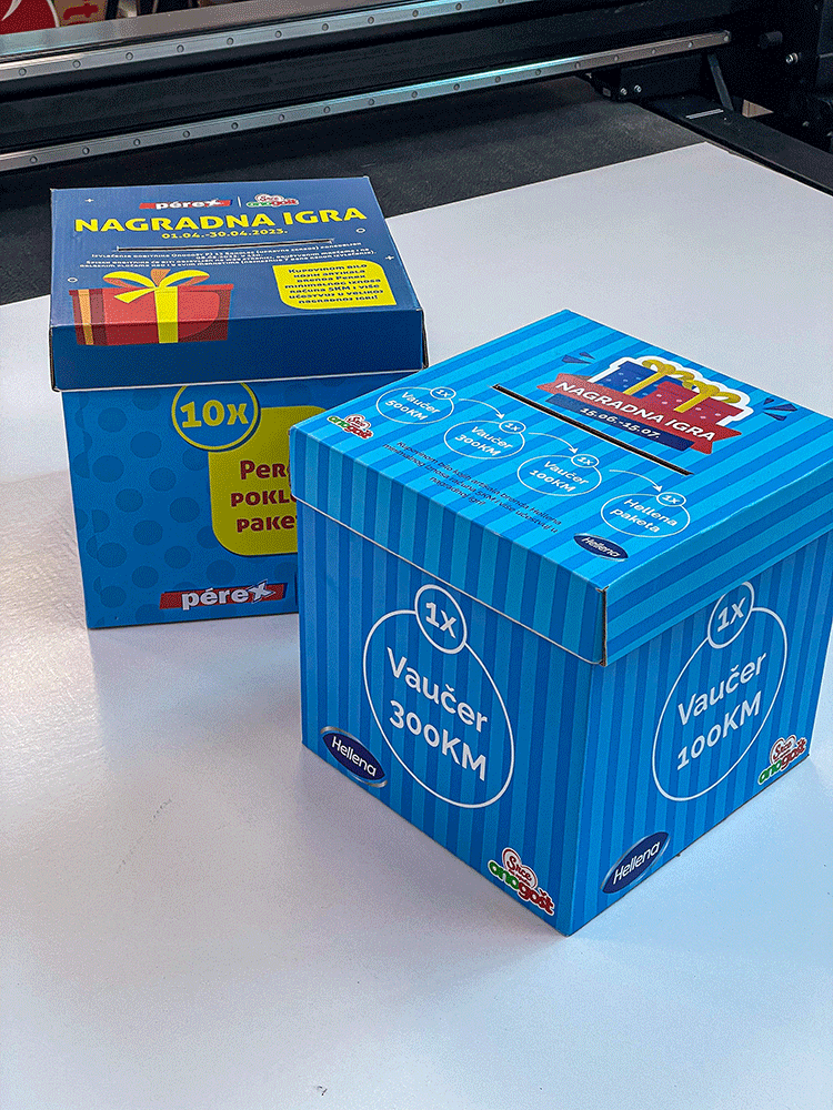 Kutije za nagradne igre mogu biti potpuno prilagođene kampanji, proizvodu ili vizuelnom identitetu brenda. Mogu sadržavati logo, naziv nagradne igre, pravila učešća, vizuale proizvoda, promotivne poruke i druge elemente koji pomažu da kampanja bude jasna i atraktivna učesnicima.