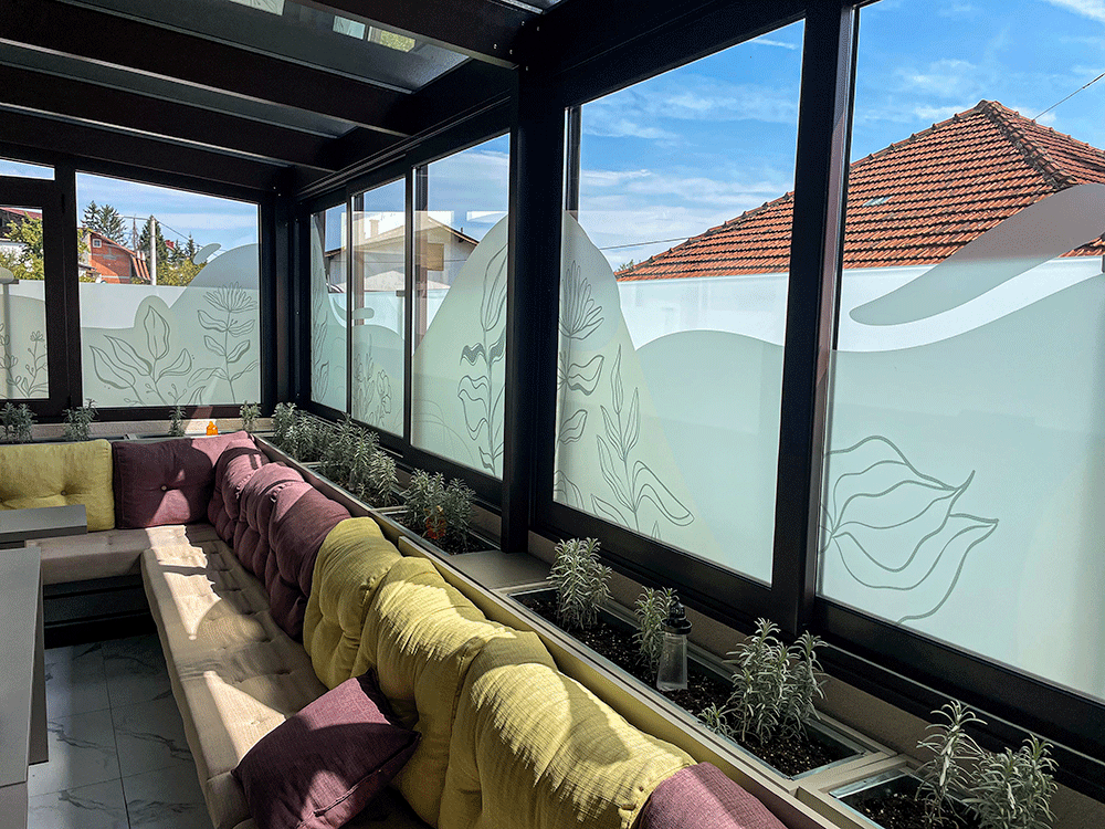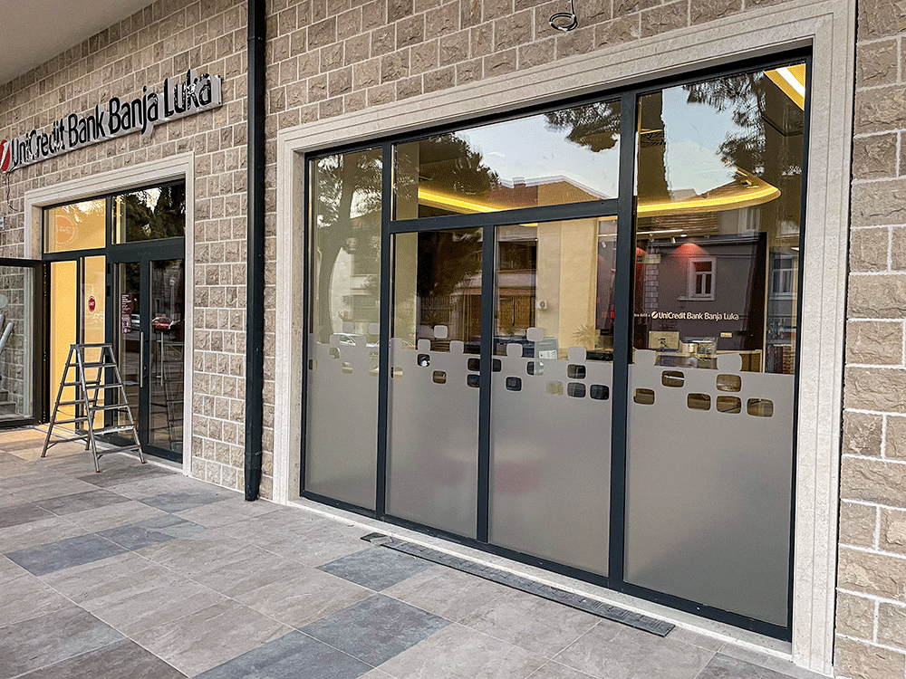 Takva primjena je posebno korisna za poslovne prostore koji žele da kroz staklene površine istaknu identitet brenda, vizuelno odvoje zone u prostoru ili dodaju suptilan, ali prepoznatljiv grafički detalj.