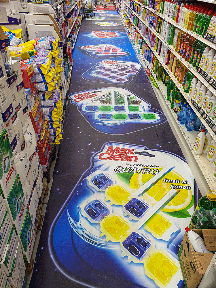 Podne naljepnice izrađuju se prema tačnim dimenzijama, obliku i namjeni prostora. Mogu sadržavati promotivne poruke, grafike, strelice, oznake za kretanje, upozorenja, kontakt informacije ili kompletan vizuelni koncept kampanje.